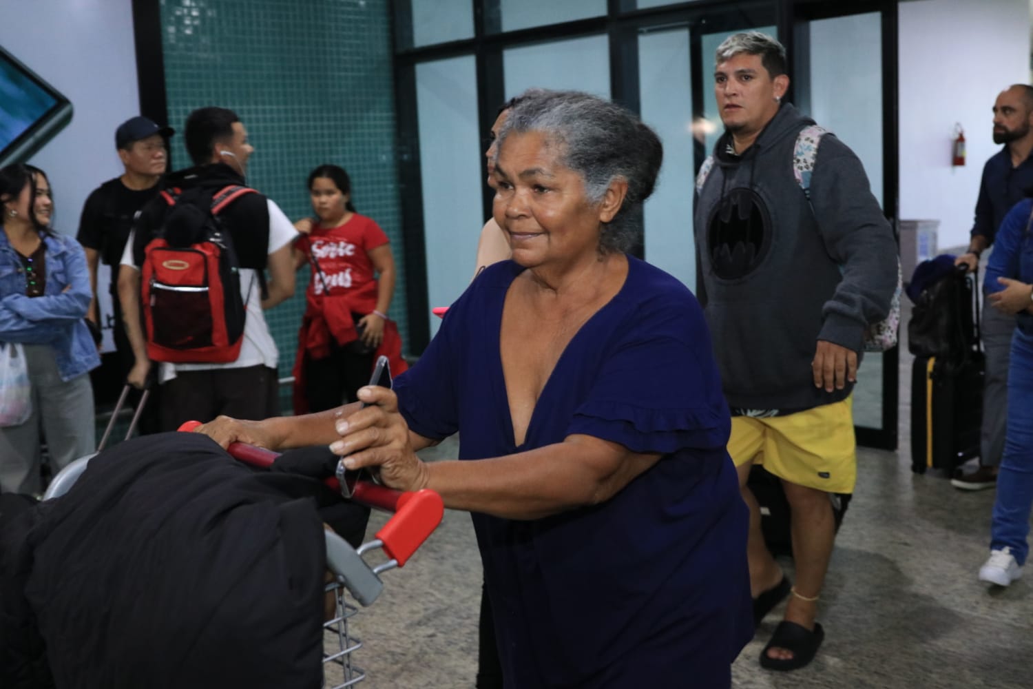 “Ficamos ilhados, nossa casa não alagou mas fiquei com meu filho, que é especial e outro de menor, ilhados, sem poder sair. Ontem à noite na hora da gente embarcar alagou todo o lajeado, a gente achou que não ia conseguir pegar o carro pra chegar no aeroporto. Quero agradecer ao Wilson Lima, se não fosse Deus e ele eu não estaria aqui, ressaltou Girley Rosa, passageira do terceiro voo de realocação.
