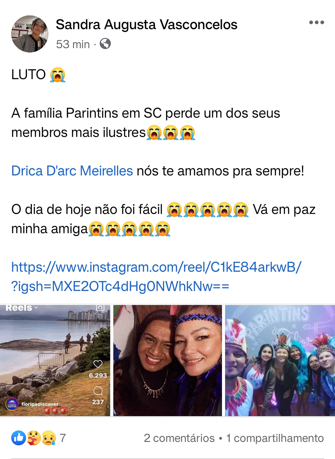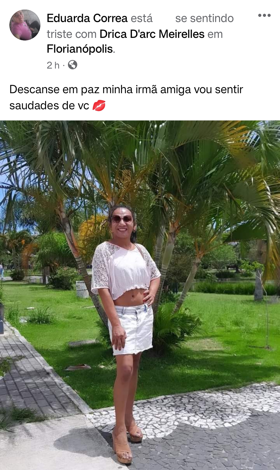 A estudante e ativista da comunidade LGBT, Drica D’arc Meirelles, 39 anos, perdeu a vida por afogamento na Beira-mar Norte, em Florianópolis, nesta madrugada de primeiro de janeiro, após o Show do Réveillon. A informação foi publicada pelos sites de notícias locais.