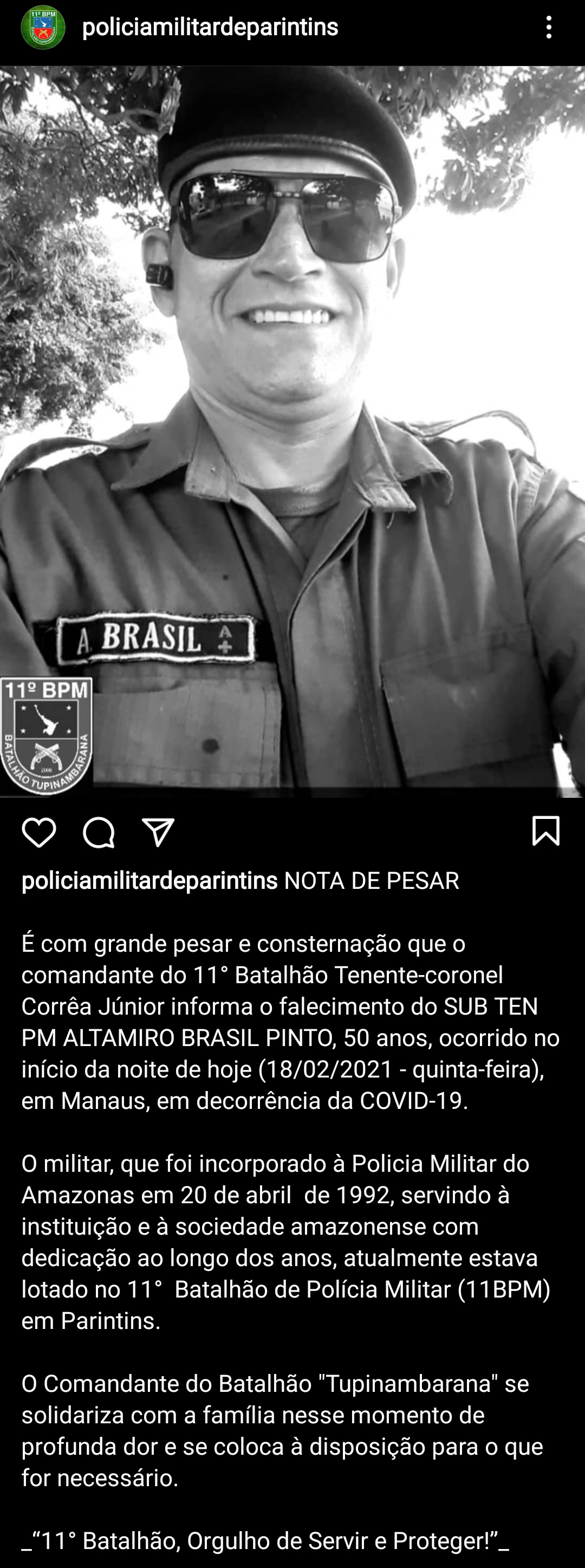 Morreu em Manaus na noite desta quinta-feira, 18, o subtenente Altamiro Brasil, policial militar lotado no 11º Batalhão da PM do município de Parintins. É o primeiro militar da corporação a perder a vida para covid-19 na ilha Tupinambarana.