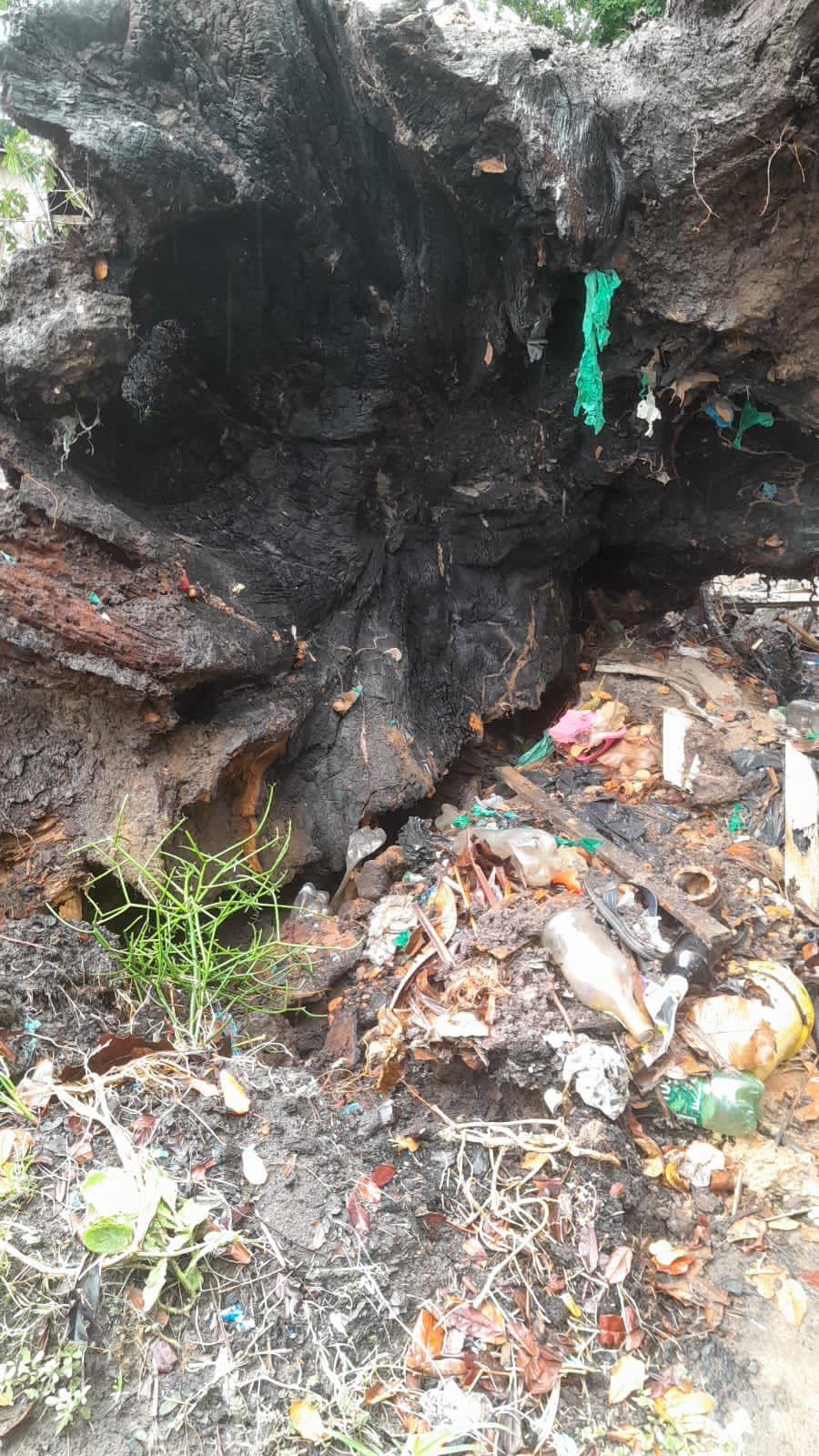 A fiscal Denise Dias e o assessor técnico Siebert Gadelha constataram o tronco queimado e resíduos sólidos ao redor, o que impactou negativamente a árvore, que ficou sem sustentação no solo, ocasionando o tombamento.