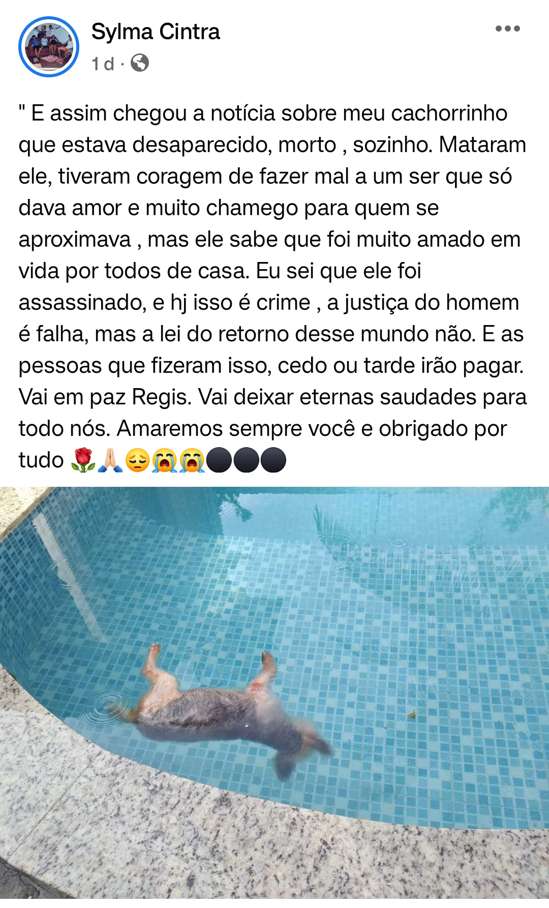 A cidade de Parintins conhecida pelo seu povo acolhedor tem vivido dias de revolta com a repetição de crimes contra os animais. Nesta quarta-feira, a sargento da Polícia Militar, Sylma Contra denunciou nas redes sociais o que fizeram com seu cachorro de estimação, chamado de Regys. Após ter desaparecido de sua residência, foi encontrado morto em uma piscina de uma casa vizinha, possivelmente após ter sido espancado.