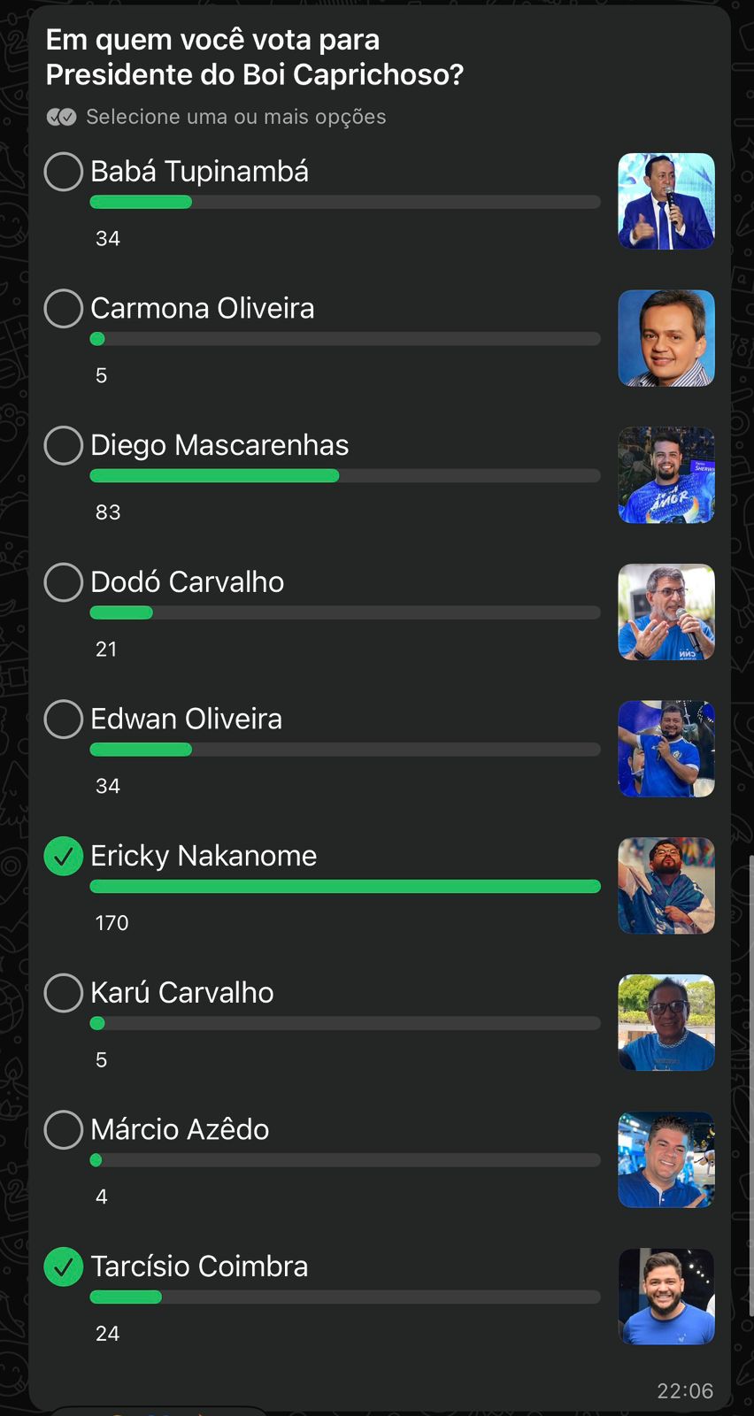 A enquete ainda em andamento acontece em um dos maiores grupos digitais dedicados ao Caprichoso e Garantido, formado por torcedores, artistas, ex-dirigentes, jornalistas e influenciadores do segmento.