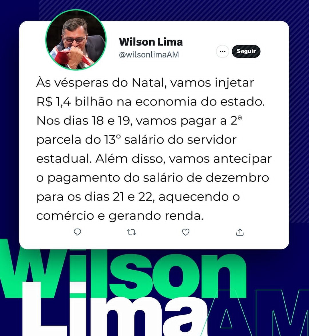 O governador Wilson Lima anunciou, nesta segunda-feira (11/12), que o pagamento da segunda parcela do 13º salário dos servidores públicos estaduais ativos e inativos será realizado nos dias 18 e 19 de dezembro, antes do prazo final estabelecido em lei (Lei nº 4.749, de 12 de agosto de 1965), que é até 20 de dezembro. Além disso, o salário de dezembro será antecipado e creditado em conta nos dias 21 e 22 deste mês.