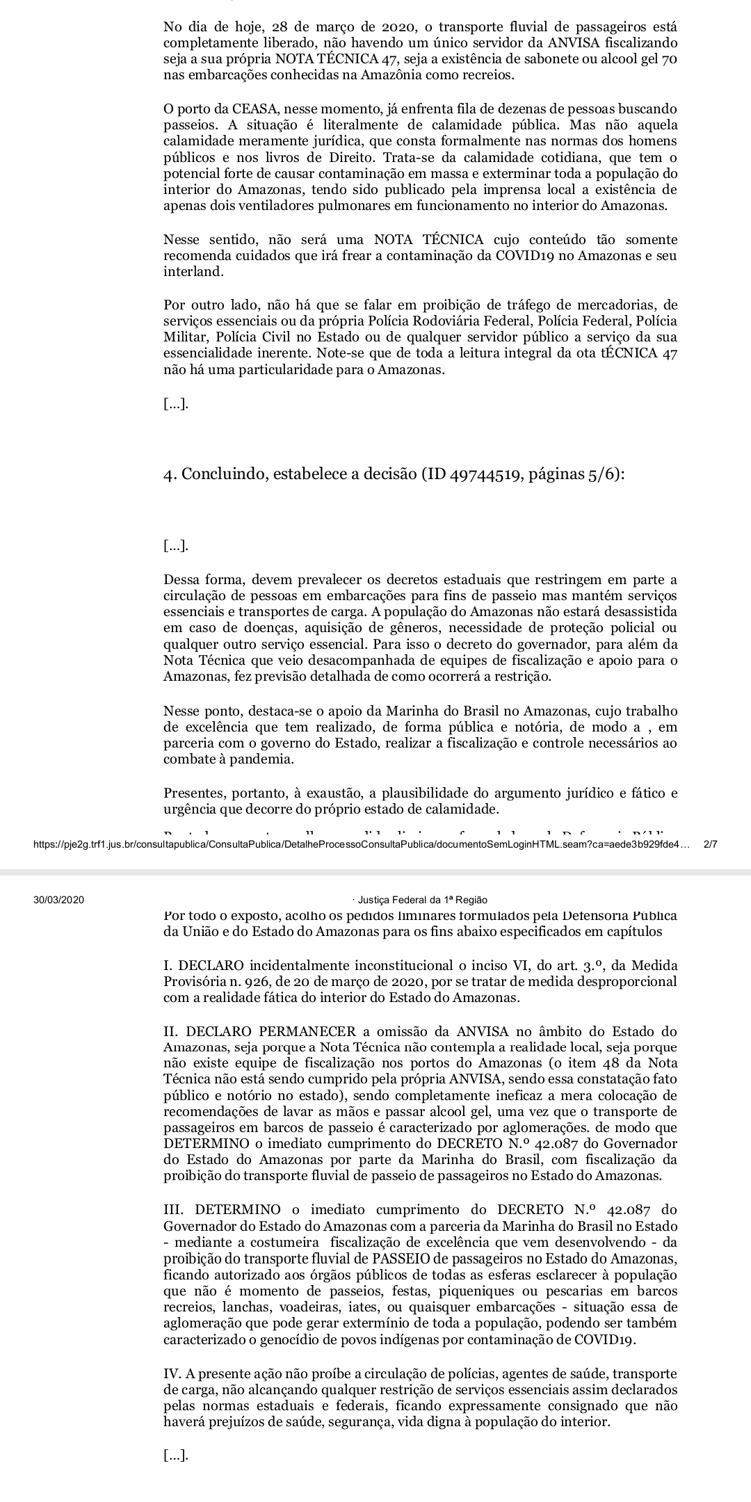 ficando autorizado aos órgãos públicos de todas as esferas esclarecer à população que não é momento de passeios, festas, piqueniques ou pescarias em barcos, recreios lanchas, voadeiras, iates, ou quaisquer embarcações - situação l essa de aglomeração que pode gerar extermínio de toda a população, podendo ser também caracterizado o genocídio de povos indígenas por contaminação de COVID19", diz trecho da sentença.