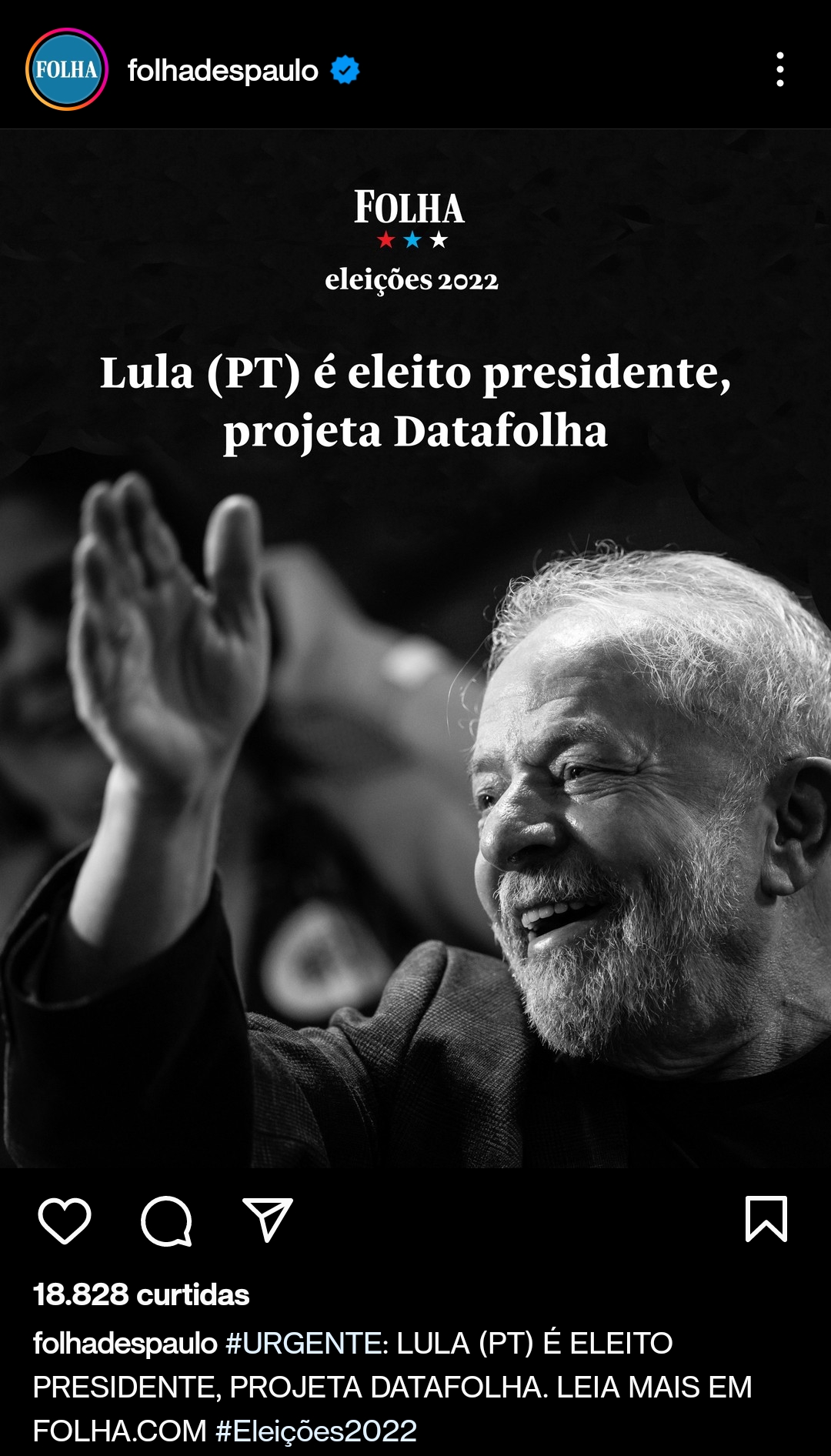 Luiz Inácio Lula da Silva está eleito presidente do Brasil, segundo projeção do jornal a folha de São Paulo e do Datafolha