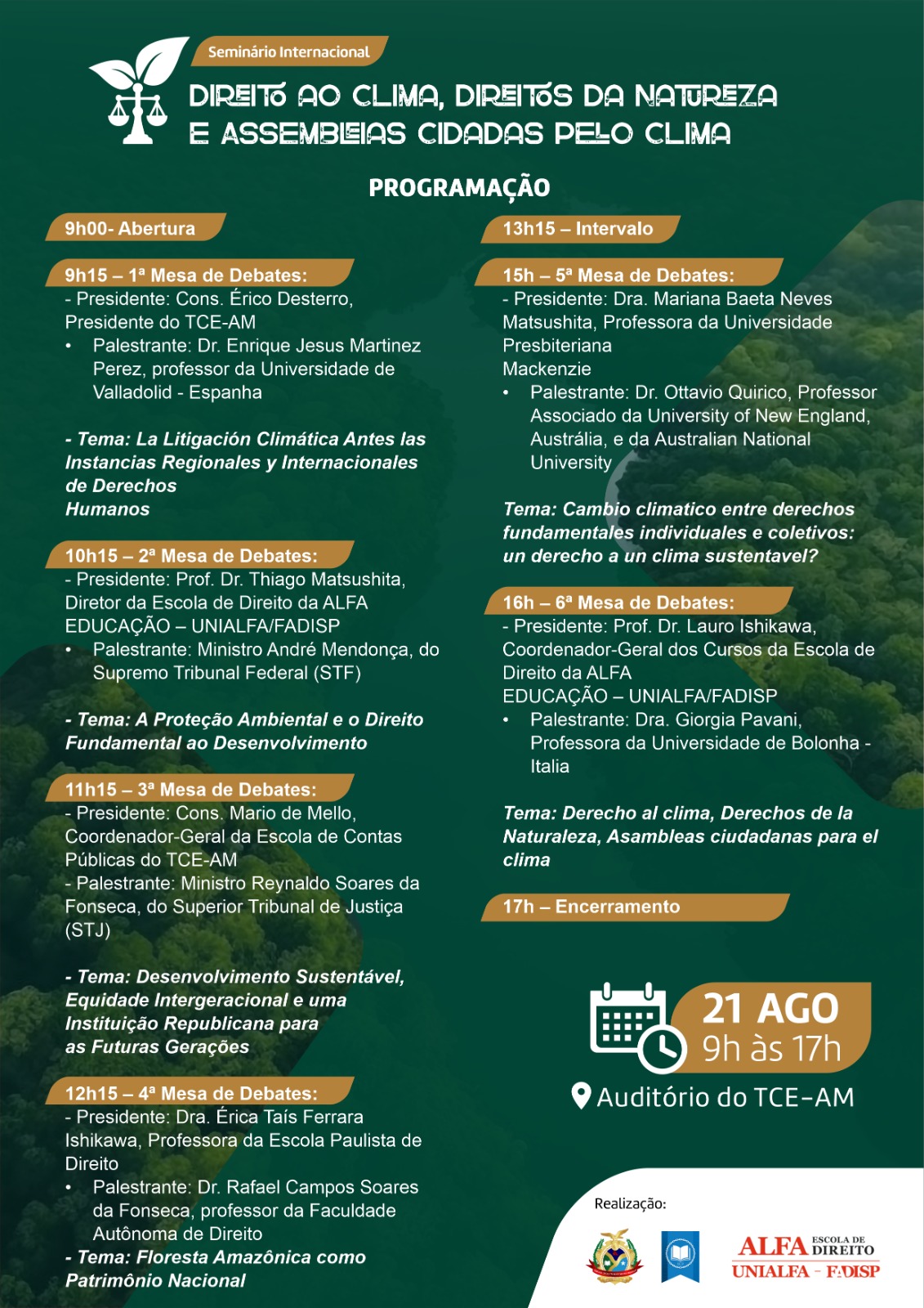 Organizado pela Escola de Contas Públicas (ECP) do TCE-AM, o Seminário Internacional tem como objetivo discutir temas relevantes relacionados ao direito climático, direitos da natureza e ações cidadãs para o enfrentamento das questões climáticas. A programação do evento contará com cinco mesas de debates, reunindo autoridades e docentes reconhecidos em suas respectivas áreas de atuação.