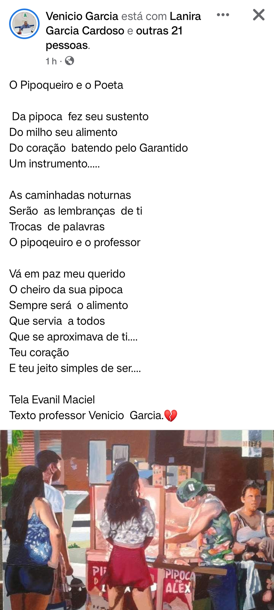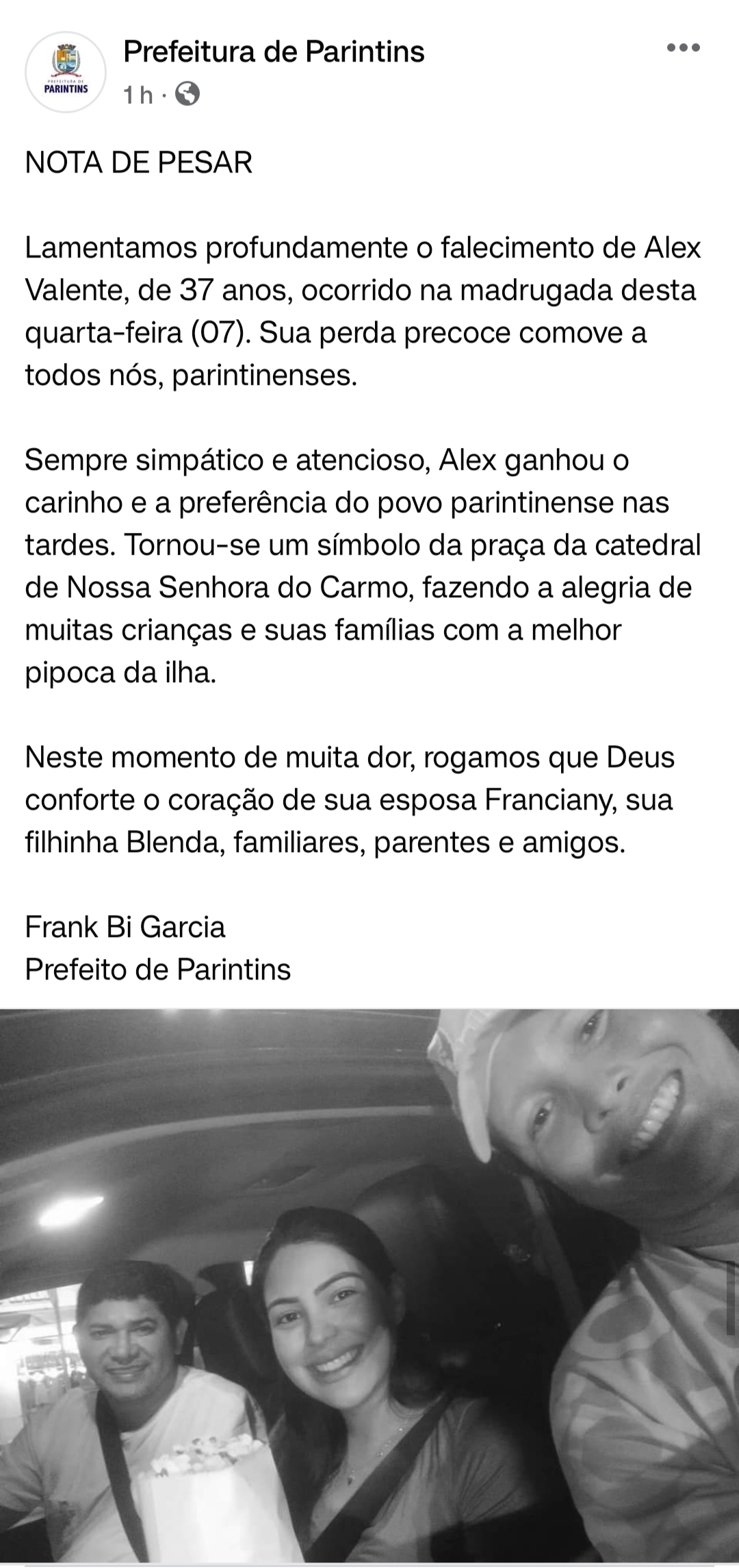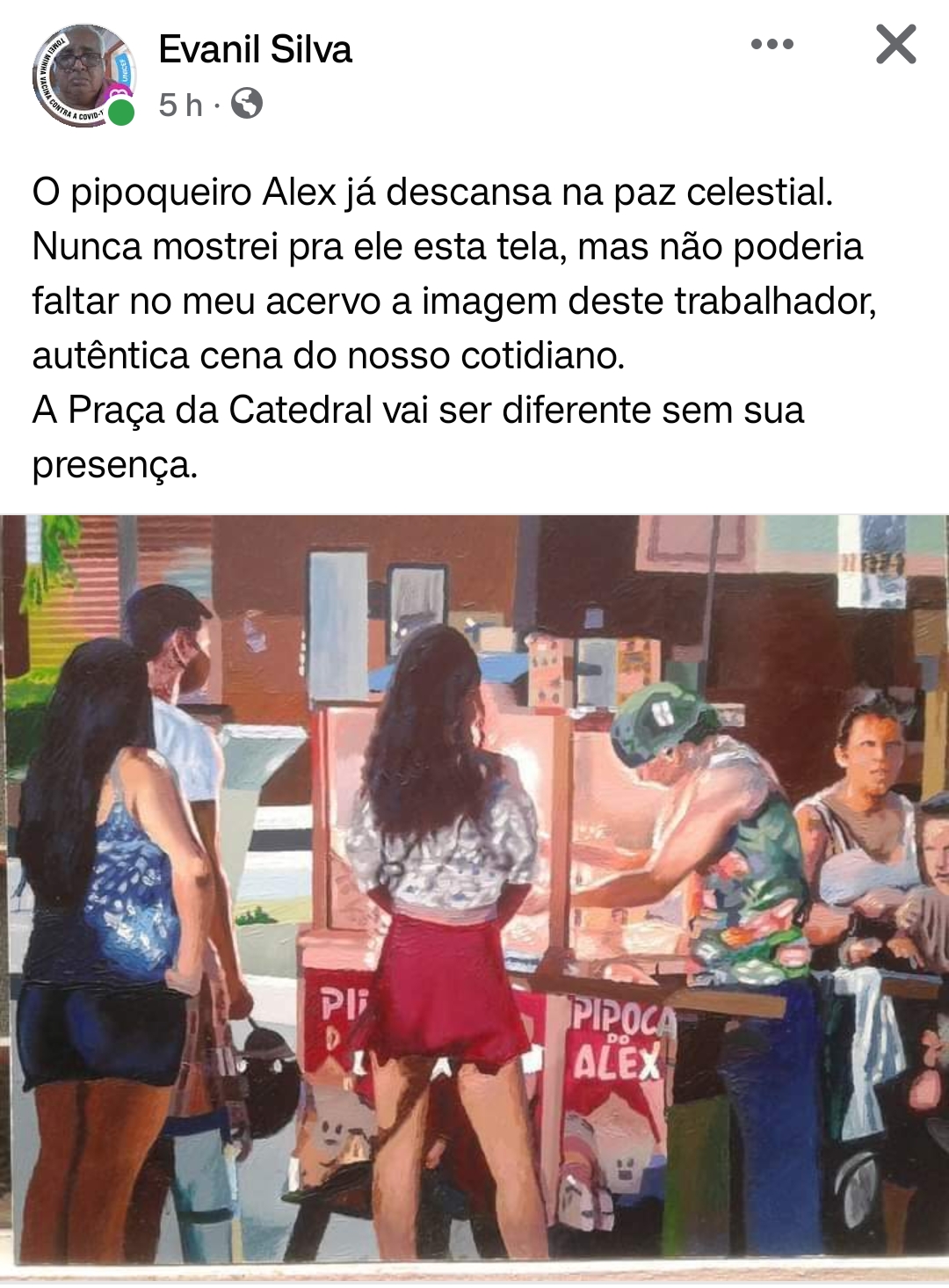 A morte do pipoqueiro Alex Valente, 37 anos, ocorrida na noite desta terça-feira, 06, no hospital Jofre Cohen comoveu Parintins. Alex fez parte da vida de milhares de famílias que passaram pela Praça da Catedral de Nossa Senhora do Carmo nos últimos anos. Com seu simples e concorrido carrinho de pipoca, alegrava crianças e adultos com o seu jeito espontâneo e divertido de atender a todos.