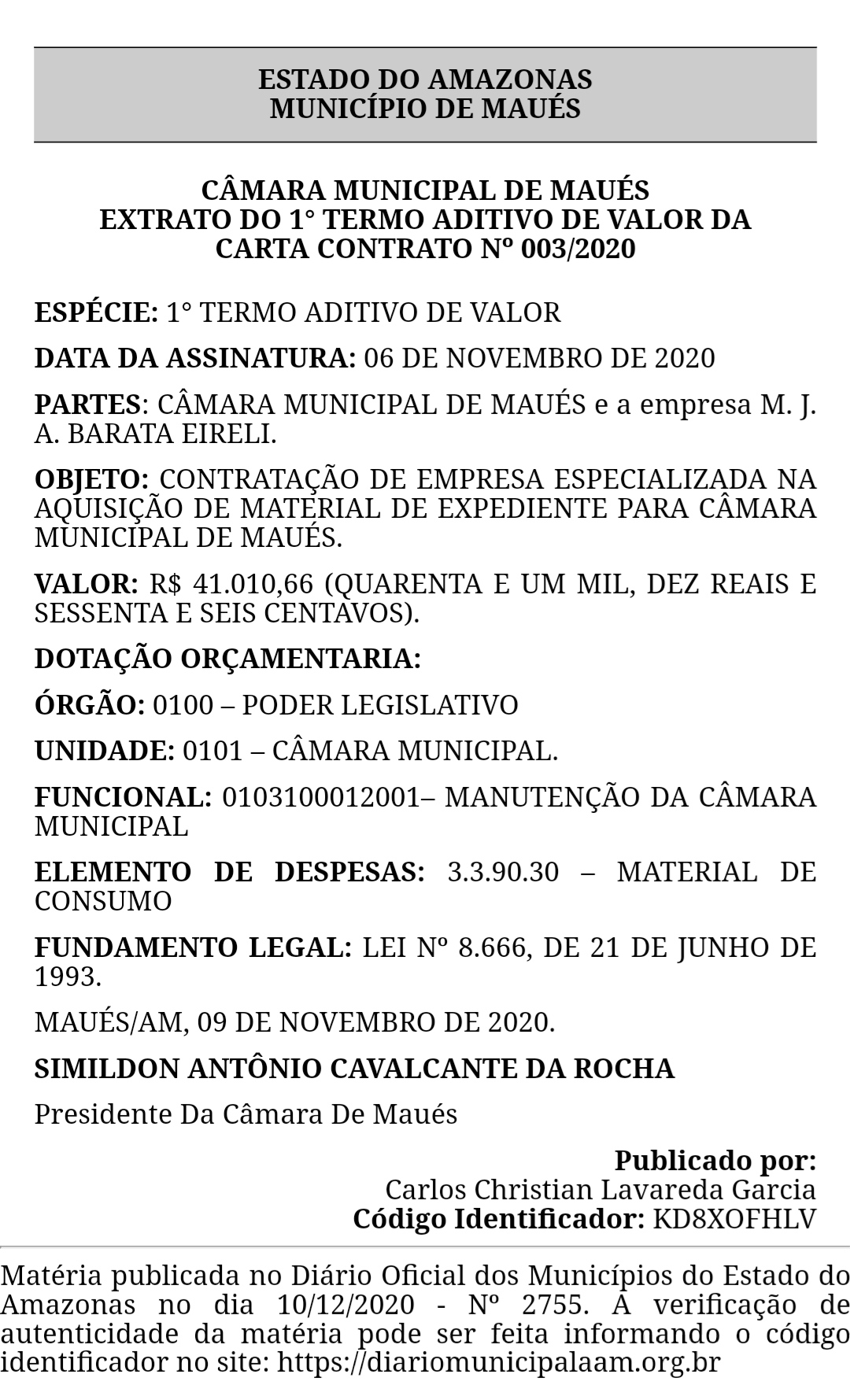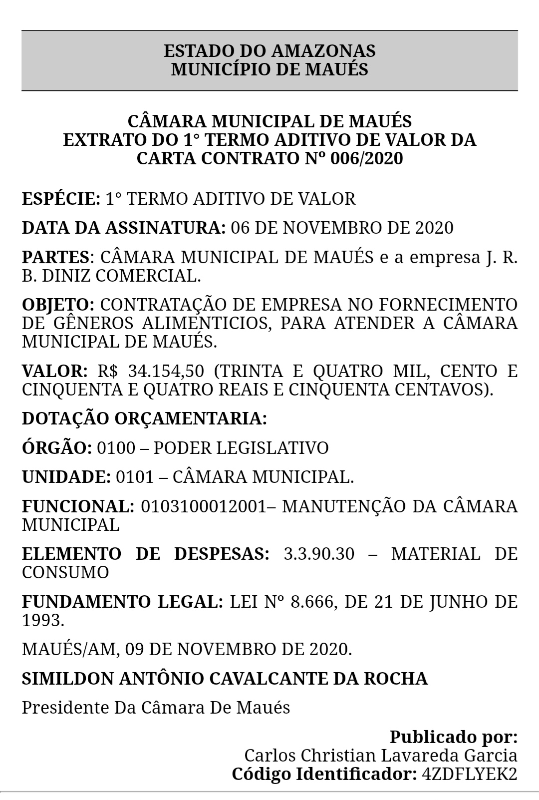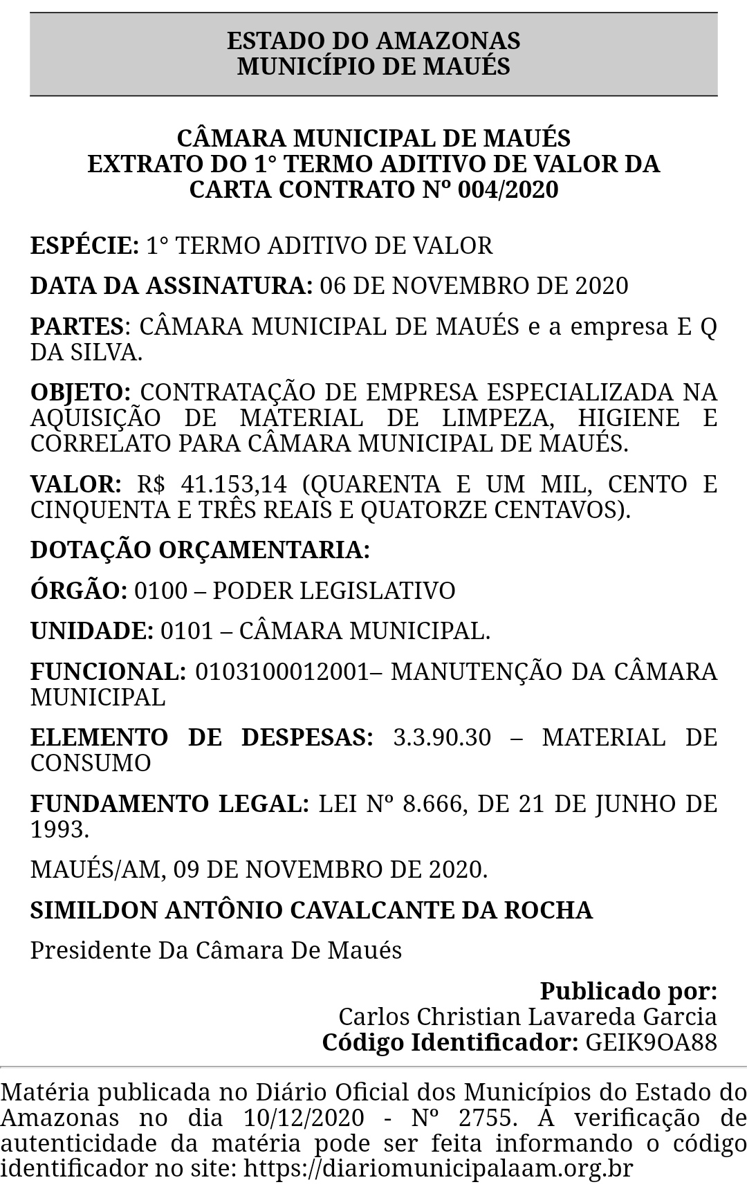 O presidente Simildon Antônio Cavalcante da Rocha, o Simoca, assinou termo aditivo no dia 6 de novembro liberando R$ R$ 41.153,14 para a empresa "E Q DA SILVIA para aquisição de material de limpeza, higiene e correlato para Câmara Municipal de Maués". A publicação se deu mais de um mês depois.