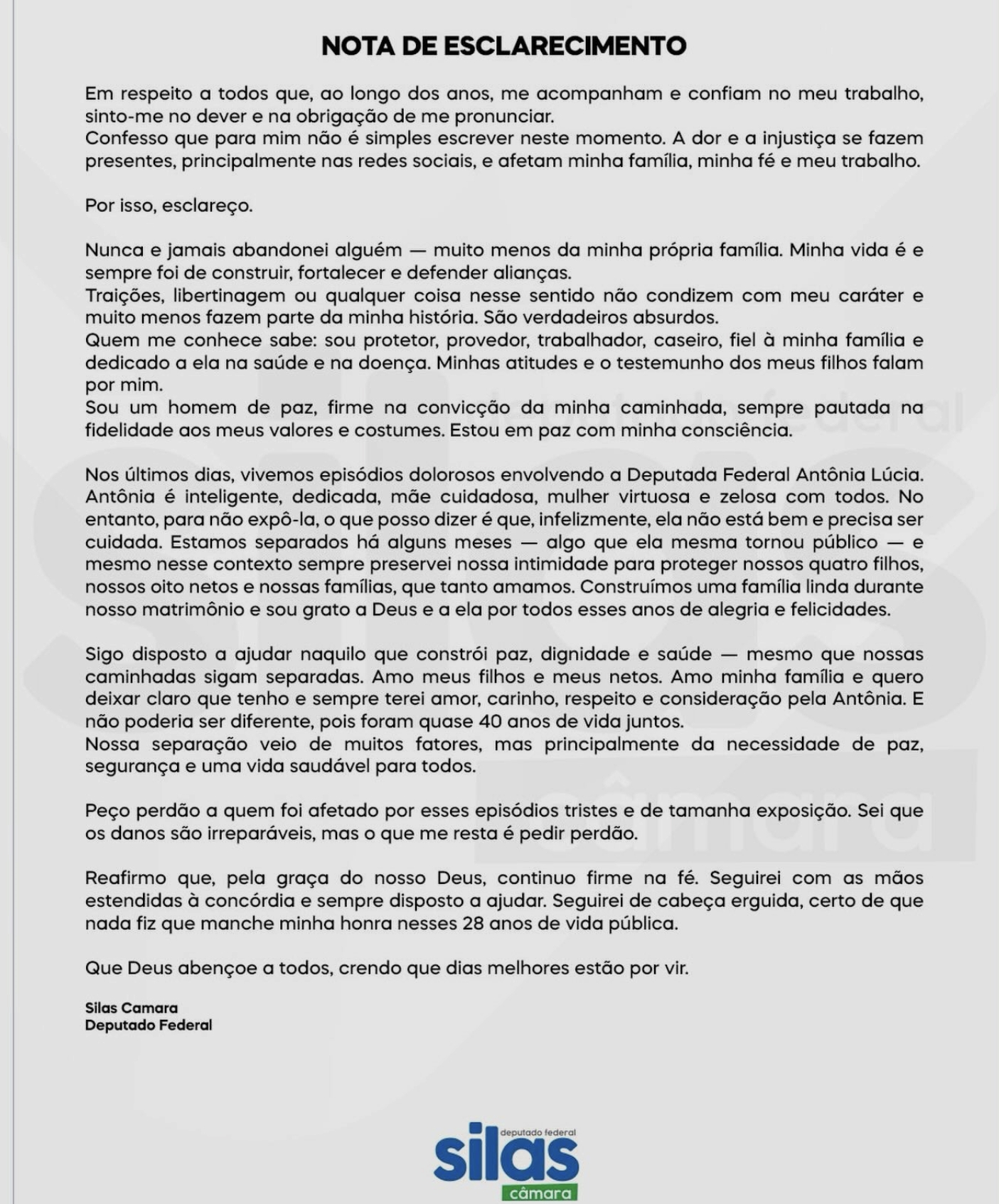 Ao final da nota, Silas pediu perdão a quem foi afetado pela exposição dos últimos dias e assegurou que não há nada em sua trajetória que manche seus 28 anos de vida pública. “Seguirei de cabeça erguida, certo de que nada fiz que manche minha honra”, afirmou, concluindo a nota com uma mensagem de fé e esperança.