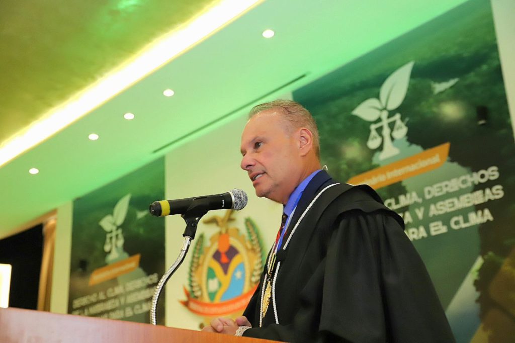 Sua apresentação focou no desafiador tema “Câmbio climático entre derechos fundamentales individuales e coletivos: un derecho a un clima sustentavel?”.