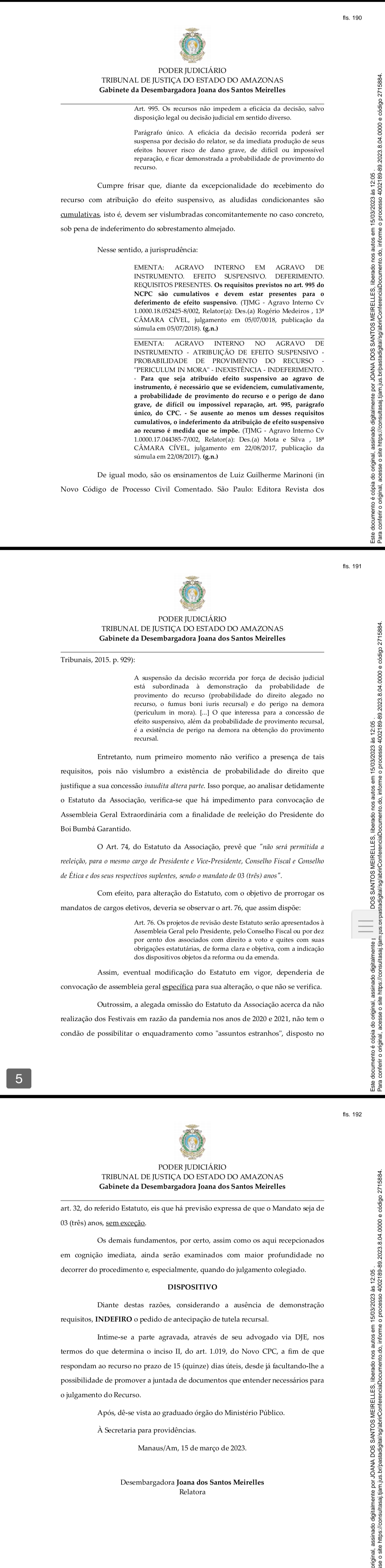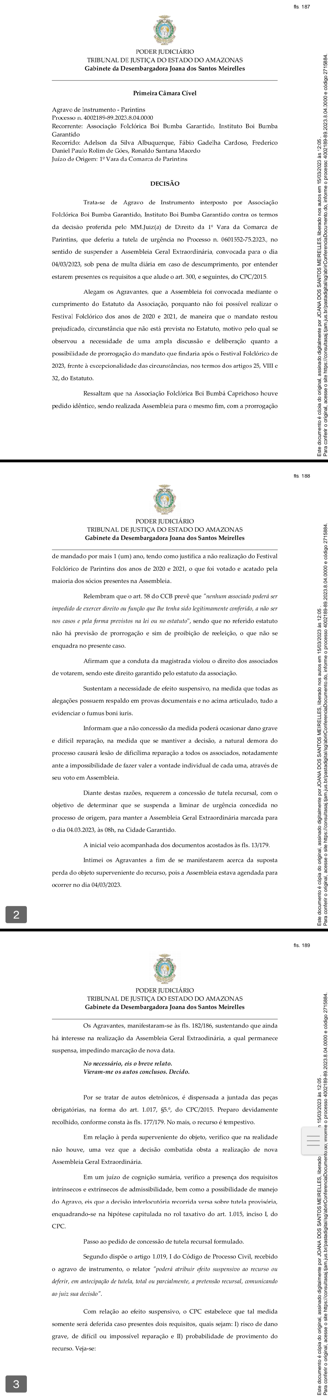 O Tribunal de Justiça do Estado do Amazonas indeferiu recurso impetrado pelo Boi Garantido para derrubar a decisão da Comarca de Parintins que suspendeu a assembleia convocada pelo Presidente Antônio Andrade que visava a prorrogação de seu mandato por mais um ano.