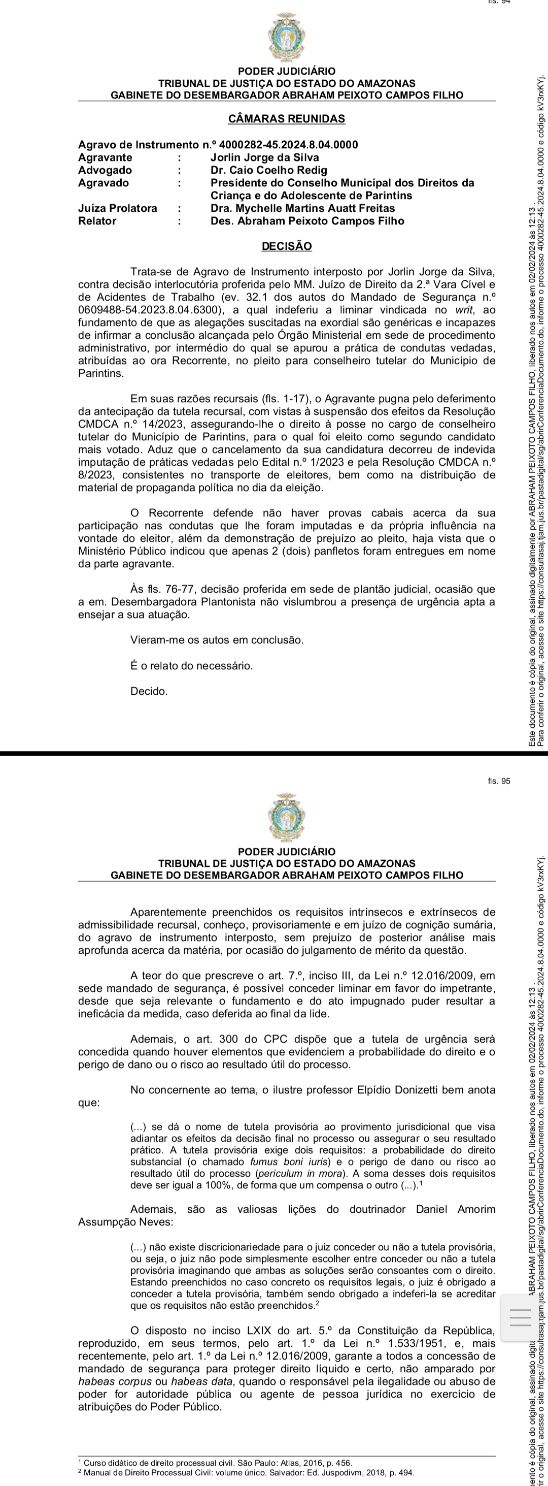 "DEFIRO antecipação da tutela recursal, para suspender os efeitos da Resolução n.º 14/2023-CMDCA em relação ao ora Agravante, determinando ao Presidente do ConselhoMunicipal dos Direitos da Criança e do Adolescente do Município de Parintins que proceda à posse do Sr. Jorlin Jorge da Silva no cargo de Conselheiro Tutelar daquela municipalidade, no prazo de 48h (quarenta e oito horas), sob pena de incidência de multa diária de R$ 1.000,00 (mil reais), limitada a 30 (trinta) dias-multa", pronunciou o desembargador na sentença.