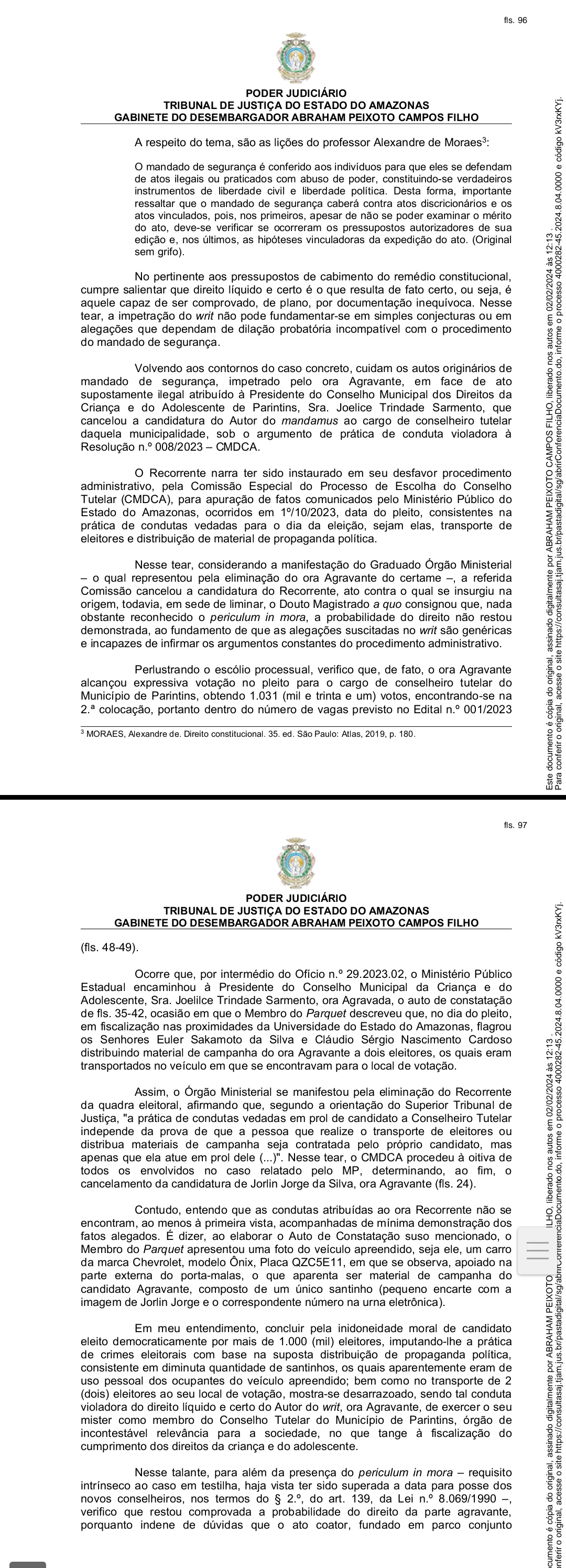 O Tribunal de Justiça do Estado do Amazonas por meio de decisão do desembargador relator Abraham Peixoto deu ganho de causa ao candidato ao Conselho Tutelar de Parintins Jorlin Jorge, alterando então o colegiado no município. Jorlin teve a candidatura cassada por meio de resolução do Conselho Municipal do Direito da Criança e do Adolescente. O CMDCA alegou que o candidato teria cometido irregularidades.