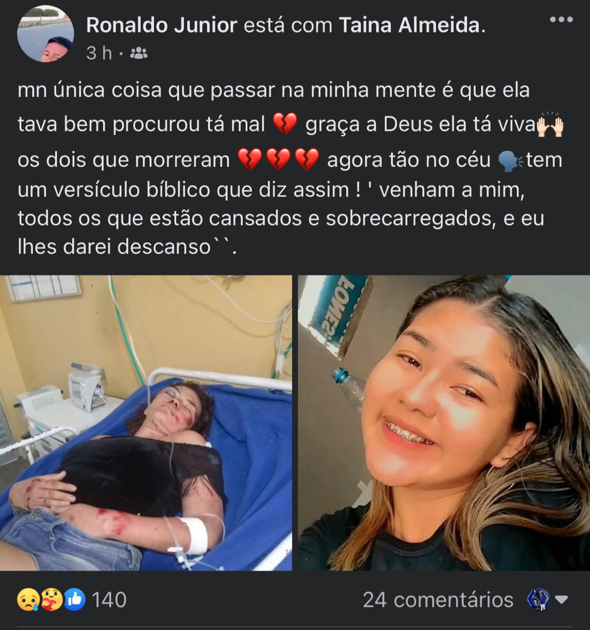 Tainá Almeida de 18 anos, continua internada no Hospital Jofre Cohen em Parintins após ter sofrido grave acidente na madrugada deste sábado, onde dois homens acabaram mortos. José Pimentel (funcionário da Ambev) e Eudson Pinheiro de 24 anos (mecânico da Revemar) não resistiram ao impacto de grande violência na estrada Eduardo Braga, próximo ao aeroporto Júlio Belém.